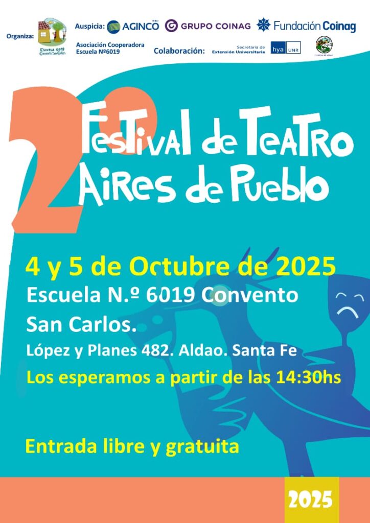 La cultura vuelve a tomar el escenario en Aldao con el regreso del Festival de Teatro Aires de Pueblo, que celebrará su segunda edición el próximo 4 y 5 de octubre en la Escuela N° 6019 Convento San Carlos – ubicada en López y Planes 482-. Tras un año de su primera edición, esta propuesta -que cuenta con entrada libre y gratuita– busca reafirmarse como un espacio de encuentro comunitario donde el arte escénico se vive en familia.