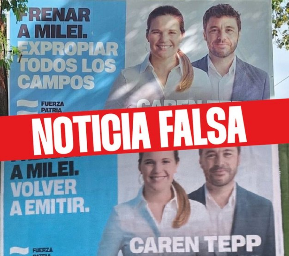 En las imágenes apócrifas se muestra a Caren Tepp, primera candidata de la lista, junto a consignas inventadas como “Frenar a Milei. Expropiar todos los campos” y “Frenar a Milei. Volver a emitir”. Desde el espacio señalaron que se trata de una maniobra de desinformación.