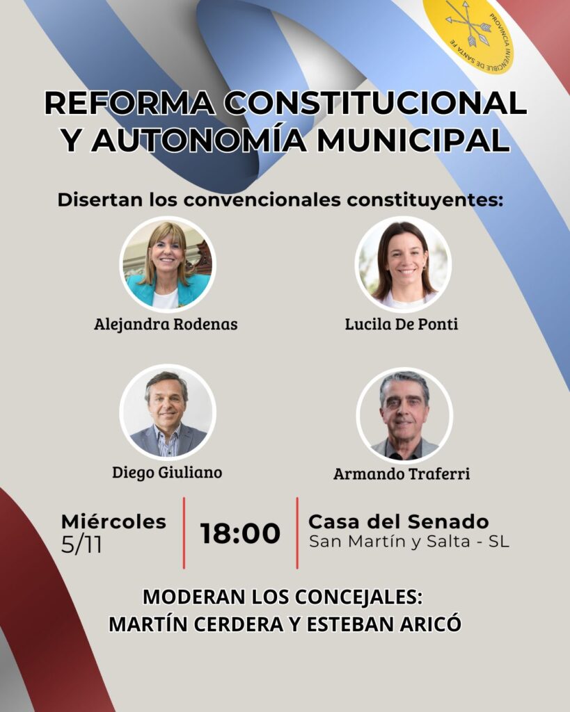 La Casa del Senado de San Lorenzo será sede, el próximo miércoles 6 de noviembre a las 18 horas, de un conversatorio titulado “Autonomía municipal y actualización constitucional”, que reunirá a destacadas figuras políticas y constituyentes para debatir sobre los desafíos institucionales de la provincia de Santa Fe.